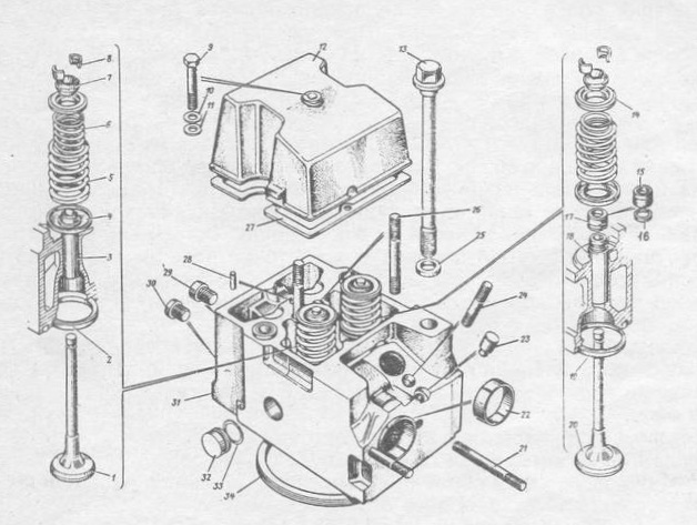 Каждая головка блока Камаз-740 устанавливается на два установочных штифта, запрессованные в блок цилиндров, и крепится четырьмя болтами из легированной стали. Один из установочных штифтов одновременно служит втулкой для подачи масла на смазку коромысел клапанов. Втулка уплотнена резиновыми кольцами. В головке блока цилиндров Камаз-740, по сравнению с головкой двигателя 740.10, увеличено отверстие слива моторного масла из-под клапанной крышки в штанговую полость. Окна впускного и выпускного каналов расположены на противоположных сторонах головки цилиндров. Впускной канал имеет тангенциальный профиль для обеспечения оптимального вращательного движения воздушного заряда, определяющего параметры рабочего процесса и экологические показатели двигателя, поэтому замена на головки цилиндров двигателя 740.10 не допускается. В головку блока цилиндров Камаз-740 запрессованы чугунные седла и металлокерамические направляющие втулки клапанов. Седла клапанов имеют увеличенный натяг в посадке по сравнению с седлами двигателя 740.10, и фиксируются острой кромкой. Выпускное седло и клапан профилированы для обеспечения меньшего сопротивления выпуску отработавших газов. Применение выпускного клапана 740.10 не рекомендуется. Стык «головка цилиндра — гильза» Камаз-740 (газовый стык) — беспрокладочный. В расточенную канавку на нижней плоскости головки запрессовано стальное уплотнительное кольцо. Посредством этого кольца головка цилиндра Камаз-740 устанавливается на бурт гильзы. Герметичность уплотнения обеспечивается высокой точностью обработки сопрягаемых поверхностей уплотнительного кольца и гильзы цилиндра. Уплотнительное кольцо дополнительно имеет свинцовистое покрытие для компенсации микронеровностей уплотняемых поверхностей. 1 — клапан выпускной; 2 — седло выпускного клапана; 3 — направляющая втулка выпускного клапана; 4 — пружинная шайба клапана; 5 — наружная пружина клапана; 6 — внутренняя пружина клапана; 7 — втулка тарелки; 8 — сухарь клапана; 9 — болт крепления крышки головки блока цилиндров; 10 — шайба плоская; 11, 25 — шайба; 12 — крышка головки блока цилиндров; 13 — болт крепления головки блока цилиндров; 14 — тарелка пружин клапана; 15 — уплотнительная манжета впускного клапана; 16 — кольцо манжеты; 17 — уплотнительная манжета впускного клапана в сборе; 18 — направляющая втулка впускного клапана; 19 — седло впускного клапана; 20 — клапан впускной; 21 — шпилька крепления патрубка выпускного коллектора; 22 — предохранительная втулка прокладки патрубка; 23 — опора скобы форсунки; 24 — шпилька крепления прижимной скобы форсунки; 26 — шпилька крепления стойки коромысел; 27 — прокладка крышки головки блока цилиндров; 28 — штифт стойки оси коромысел; 29 — ввертыш крепления впускного коллектора; ввертыш крепления водяной трубы; 31 — головка блока цилиндров; 32 — заглушка головки блока цилиндров; 33 — уплотнительное кольцо заглушки; 34 — кольцо уплотнительное газового стыка.