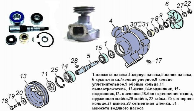 Водяной насос (помпа) двигателя КамАЗ 740 крепится на переднюю левую часть блока цилиндров. Для крепления к блоку, в корпусе помпы имеется три отверстия под болты. Ремонт помпы может потребоваться в случае потери ею герметичности и образования течи охлаждающей жидкости, а также если заклинил вал водяного насоса. Для демонтажа насоса для произведения ремонтных работ: 1. слейте охлаждающую жидкость, 2. снимите ремни привода со шкива, 3. выверните три болта крепления, 4. отсоедините водяные трубы. 5. Извлекаем насос, при этом вынимаем патрубки подвода к корпусу термостатов и гидромуфте 6. Отворачиваем болт крепления шкива насоса 18 7. Отворачиваем колпачковую гайку крепления крыльчатки 22 8. С помощью выколотки из мягкого металла и молотка выбиваем вал вместе с подшипниками и манжетами. 9. Собираем в последовательности, показанной на рисунке. После сборки запрессовываем Литол 24 через пресмасленку. Заменяем уплотнительные кольца и прокладку. При установке патрубков смазываем Литолом уплотнительные кольца. В запасные части поставляется, как в сборе валик с подшипниками и манжетами, так и отдельно.