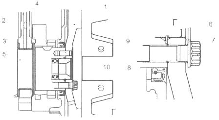 1 - маховик; 2- блок цилиндров; 3- коленчатый вал; 4 - картер маховика; 5- подшипник первичного вала коробки передач; 6- шайба; 7- болт крепления маховика; 8- манжета уплотнения коленчатого вала; 9- пыльник манжеты; 10 - штифт установочный маховика. Диаметры шеек коленвала Камаз-740 : коренных 95+0.011 мм, шатунных 80±0,0095 мм. Для восстановления двигателя Камаз-740 предусмотрены восемь ремонтных размеров вкладышей. Вкладыши 7405.1005170 Р0, 7405.1005171 Р0, 7405.1005058 Р0 применяются при восстановлении двигателя без шлифовки коленчатого вала. При необходимости шейки коленчатого вала заполировываются. Допуски на диаметры шеек коленчатого вала Камаз-740, отверстий в блоке цилиндров и отверстий в нижней головке шатуна при проведении ремонта двигателя должны быть такими же, как у номинальных размеров новых двигателей. Коренные и шатунные подшипники Камаз-740 изготовлены из стальной ленты, покрытой слоем свинцовистой бронзы толщиной 0.3 мм, слоем свинцово-оловянистого сплава толщиной 0.022 мм и слоем олова толщиной 0.003 мм. Верхние 3 и нижние 4 вкладыши коренных подшипников не взаимозаменяемы. В верхнем вкладыше имеется отверстие для подвода масла и канавка для его распределения. Оба вкладыша 4 нижней головки шатуна взаимозаменяемы. От проворачивания и бокового смещения вкладыши Камаз-740 фиксируются выступами (усами), входящими в пазы, предусмотренные в постелях блока, крышках подшипников и в постелях шатуна. Вкладыши Камаз-740 имеют конструктивные отличия, направленные на повышение их работоспособности при форсировке двигателя турбонаддувом, при этом изменена маркировка вкладышей на 7405.1004058 (шатунные), 7405.1005170 и 7405.1005171 (коренные). Поэтому при проведении ремонтного обслуживания не рекомендуется замена вкладышей на серийные с маркировкой 740.100.., так как при этом произойдет существенное сокращение ресурса двигателя. Крышки коренных подшипников Камаз-740 изготовлены из высокопрочного чугуна марки ВЧ50. Крепление крышек осуществляется с помощью вертикальных и горизонтальных стяжных болтов 3, 4, 5, которые затягиваются по определенной схеме регламентированным моментом. Маховик Камаз-740 закреплен восемью болтами 7, изготовленными из легированной стали с двенадцатигранной головкой, на заднем торце коленчатого вала и точно зафиксирован двумя штифтами и установочной втулкой. С целью исключения повреждения поверхности маховика Камаз-740 под головки болтов устанавливается шайба 6. На обработанную цилиндрическую поверхность маховика напрессован зубчатый венец, с которым входит в зацепление шестерня стартера при пуске двигателя. При выполнении регулировочных работ по установке угла опережения впрыска топлива и величин тепловых зазоров в клапанах маховик Камаз-740 фиксируется при помощи фиксатора. При этом конструкция имеет следующие основные отличия от серийной: