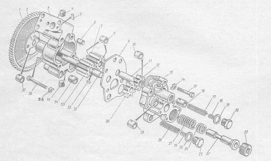 Масляный насос закреплен на нижней плоскости блока цилиндров. Ведущее зубчатое колесо напрессовано на передний конец коленчатого вала и имеет 64 зуба, ведомое 52, то есть передаточное отношение 0.8125. Зазор в зацеплении приводных зубчатых колес регулируется прокладками, устанавливаемыми между привалочными плоскостями насоса и блока, который должен быть 0,15-0,35 мм, момент затяжки болтов крепления масляного насоса к блоку должен быть 49-68.6 Н.м (5-7 кгс.м). Масляный насос: I - шестерня привода масляного насоса; 2 - корпус основной нагнетательной секция; 3 - ведущая шестерня нагнетающей секции; 4 - проставка; 5 -ведущая шестерня радиаторной секции; 6 - корпус радиаторной секции; 7 -ведомая шестерня радиаторной секции; 8 - ведомая шестерня нагнетающей секции; 9 - предохранительный клапан нагнетающей секции; 10 - пробка; II - дифференциальный клапан; 12 - предохранительный клапан радиатор-ной секции; 13 - регулировочные шайбы. Масляный насос двухсекционный, шестеренчатого типа. Основная секция 2 нагнетает масло в систему смазки двигателя; радиаторная секция 6 - в фильтр центробежной очистки, а затем в масляный радиатор. Секции насоса отделены друг от друга проставкой, имеющей общее всасывающее отверстие. Ведущие шестерни 3 и 5 напрессованы на ведущий валик, который вращается в подшипниках скольжения, установленных в корпусах обеих секций. Ведомые шестерни 7 и 5 с подшипниками скольжения установлены на ось масляного насоса, которая предохранена от выпадания стопорным кольцом. Предохранительный клапан 12, встроенный в корпус радиаторной секции, отрегулирован на давление 8.8,5 кгс/см и перепускает масло из нагнетающей во всасывающую полость. Предохранительный клапан 9, встроенный одновременно в корпус 6 радиаторной и корпус 2 нагнетающей секций, отрегулирован на давление 8.8,5 кгс/см и также перепускает масло из нагнетающей во всасывающую полость. Дифференциальный клапан 11, установленный в корпусе 2, предназначен для ограничения давления в главной магистрали и отрегулирован на давление начала открытия 4.4,5 кгс/см . Нагнетающая секция насоса работает по контуру насос-поддон до тех пор, пока давление масла в системе не выровняется до нормы. Масляный насос крепится к передней перегородке нижней плоскости блока цилиндров и приводится во вращение от шестерни коленчатого вала. Поддон картера прикреплен к блоку цилиндров болтами с пружинными шайбами. Между поддоном и блоком установлена резинопробковая прокладка толщиной 2,5 мм, обеспечивающая герметичность соединения. Масло заливается через горловину, установленную в задней части блока с правой стороны. Количество масла в поддоне замеряется указателем уровня масла, на стержне которого нанесены метки «В» и «Н». Насос масляный: 1 — ведомая шестерня привода масляного насоса; 2 — сегментная шпонка ведущей шестерни; 3 — корпус нагнетающей секции со втулкой в сборе; 4 — пробка масляного клапана радиаторной секции; 5 — установочный штифт; 6 — установочная втулка корпуса нагнетающей секции; 7 — шестерня ведомая нагнетающей секции в сборе; 8, 10 — втулка оси ведомая шестерен; 9 — проставка масляного насоса; 11 — ось ведомых шестерен; 12 — ведомая шестерня радиаторной секции а сборе; 13 — корпус радиаторной секции со втулкой в сборе; 14, 38 — шайба замковая; 15 — болт стяжной масляного насоса; 16— клапан предохранительный; 17 — пруж