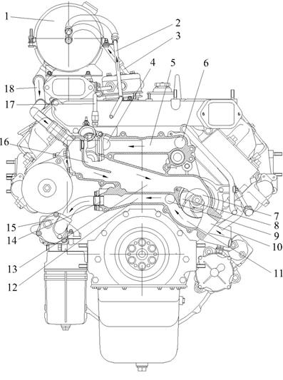 Схема системы охлаждения: 1 – расширительный бачок; 2 – пароотводящая трубка; 3 – трубка отвода воздуха из компрессора; 4 – канал выхода жидкости из правого ряда цилиндров; 5 – соединительный канал; 6 – канал выхода жидкости из левого ряда цилиндров; 7 – входная полость водяного насоса; 8 – водяной насос; 9 – канал входа жидкости в левый ряд блока; 10 – канал подвода жидкости в насос из радиатора; 11 – выходная полость насоса; 12 – соединительный канал; 13 –перепускной канал из водяной коробки на вход насоса; 14 – канал отвода жидкости в теплообменник масляный; 15 – теплообменник масляный; 16 – водяная коробка; 17 – трубка подвода жидкости в компрессор; 18 – перепускная труба.