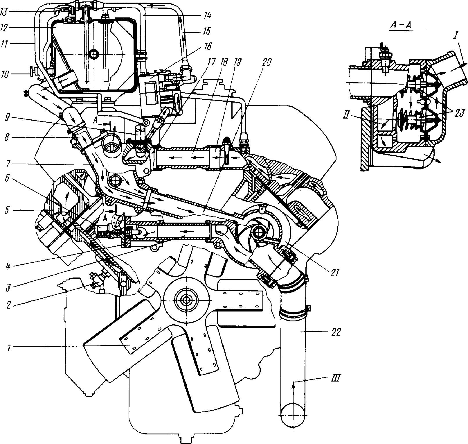 Схема рубашки охлаждения: 1 – вентилятор; 2 – сливной кран системы охлаждения; 3 – труба подводящая правого полу блока; 4 – патрубок подводящей трубы; 5 – головка цилиндров; 6 – выключатель гидромуфты привода вентилятора; 7 – коробка термостатов; 8 – патрубок отвода воды из бачка в водяной насос; 9 – патрубок отвода воды в отопитель; 10 – кран контроля уровня охлаждающей жидкости; 11 – труба воздухоотводящая от радиатора; 12 – бачок расширительный; 13 – пробка паро-воздушная; 14 – трубка перепускная от двигателя к расширительному бачку; 15 – трубка соединительная от компрессора к бачку; 16 – компрессор; 17 – труба водосборная правая; 18 – труба водяная соединительная; 19 – труба водосборная левая; 20 – труба перепускная термостатов; 21 – насос водяной; 22 – колено отводящего патрубка водяного трубопровода; 23 – термостат; I - в радиатор при открытых термостатах; II – в насос при закрытых термостатах; III - из радиатора.