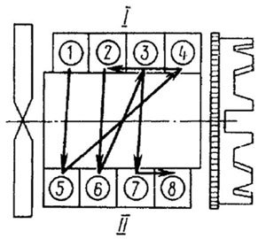 1. Снять крышки головок цилиндров. Проверьте моменты затяжки и при необходимости затяните болты крепления головок цилиндров 157-176 Н/м (16-18 кгс/м); 2. Установить фиксатор маховика в нижнее положение; 3. Снять крышку люка в нижней части картера сцепления. Вставляя ломик в отверстие на маховике проворачивать коленчатый вал, пока фиксатор не войдет в зацепление с маховиком. При регулировке коленчатый вал устанавливается последовательно в положения I-IV, которые определяются его поворотом относительно начала впрыскивания в первом цилиндре на угол, указанный ниже. Впрыскивание топлива в первом цилиндре мотора начинается, когда фиксатор маховика входит в зацепление с маховиком, а метка на приводе ТНВД находится вверху. При каждом положении коленчатого вала регулировать одновременно зазоры клапанов двух цилиндров в порядке их работы. 4. Проверить положение меток на торце корпуса муфты опережения впрыскивания топлива и фланца ведущей полумуфты привода ТНВД. Если риски находятся внизу, вывести фиксатор из зацепления с маховиком, провернуть коленчатый вал на один оборот, при этом фиксатор должен войти в зацепление с маховиком; 5. Установить фиксатор в верхнее положение; 6. Провернуть коленчатый вал по ходу вращения (против часовой стрелки, если смотреть со стороны маховика) на угол 60 гр. угловое расстояние между двумя соседними отверстиями соответствует 30 гр., т. е. в положение I, при этом клапаны первого и пятого цилиндров должны быть закрыты (штанги клапанов легко проворачиваются от усилия руки); 7. Проверить Моменты затяжки гаек крепления стоек коромысел 42-54 Н/м (4,3-5,5 кгс/м) регулируемых цилиндров и при необходимости затянуть их; 8. Проверьте щупом зазоры между носками коромысел и торцами стержней клапанов первого и пятого цилиндров. Щупы толщиной 0,3 миллиметра для впускного и 0,4 миллиметра для выпускного клапанов (передние клапаны правого ряда цилиндров впускные, левого ряда — выпускные). Закручивая или ослабляя регулировочный винт, добейтесь того, чтобы щуп двигался между коромыслом и стержнем, с небольшим усилием не сгибаясь. Не вынимая щуп, закручивайте контргайку, удерживая регулировочный винт от проворачивания, отвёрткой. Снова проверьте, как двигается щуп. Для проверки можете попробовать вставить в зазор щуп толщиной 0,35 мм, он не должен проходить в отрегулированный зазор для впускного клапана. И соответственно щуп 0,45 не должен входить в отрегулированный зазор выпускного клапана. Желательно проверить штанги (штанга должна вращаться без заеданий), в противном случае она может иметь изогнутость. Это потребует её замены или ремонта. Отрегулировав зазоры на первом цилиндре, переходите к пятому цилиндру (он находится на противоположной стороне двигателя) и выполните регулировку, так же, как и на первом цилиндре. 9. Дальнейшую регулировку зазоров в клапанном механизме проводить попарно в цилиндрах: - четвертом и втором (положение II); - шестом и третьем (положение III); - седьмом и восьмом (положение IV), проворачивая коленчатый вал по ходу вращения каждый раз на 180гр; 10. Пустить мотор и проверить его работу, при правильно отрегулированных зазорах стука в клапанном механизме не должно быть; 11. Установить крышки люка картера сцепления и головок цилиндров. Регулировка зазоров клапанов КамАЗ завершена. Данная процедура требует определённых на