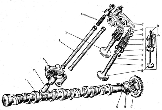 Механизм газораспределения этого двигателя состоит из распределительного вала 1 (рис. 1) с шестерней 17, толкателей 2 с направляющими 3, штанг 4, коромысел 6 с регулировочными винтами 5 и контргайками 7, впускных 14 и выпускных 15 клапанов с пружинами 10,11 и деталями их крепления, привода распределительного вала.Механизм газораспределительный. РИС. 1