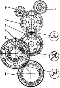 1-шестерня ведущая;2,3-шестерни промежуточные;4-шестерня распределительного вала; 5-шестерня привода топливного насоса; 6-шестерня привода насоса усилительного механизма; 7-шестерня привода компрессора. Привод распределительного вала осуществляется от ведущей шестерни 1 (рис, 2), установленной на хвостовике коленчатого вала через блок промежуточных шестерен 2 и 3. Все шестерни стальные, штампованные с термообработанными прямыми зубьями. Блок шестерен вращается на сдвоенном коническом роликоподшипнике, установленном на оси, закрепленной на заднем торце блока цилиндров. От шестерни распределительного вала через шестерню 5 получает привод топливный насос высокого давления, а от шестерни 5 через шестерни 6 и 7 соответственно насос гидроусилителя рулевого привода и компрессор. Для согласованной работы кривошипно-шатунного газораспределительного механизмов и топливного насоса шестерни устанавливаются по меткам «О» и рискам, нанесенным на их торцах. Работа механизма газораспределения заключается в следующем. Вращение коленчатого вала двигателя через блок промежуточных шестерен передается на распределительный вал, кулачки которого набегают на толкатели и заставляют их перемещаться. Усилия от толкателей через штанги и коромысла передаются клапанам, заставляя их открываться. При сбегании кулачков с толкателей клапаны закрываются под действием своих пружин. Фазами газораспределения называются продолжительность открытия впускных и выпускных клапанов, выраженных в углах поворота коленчатого вала относительно мертвых точек. Для лучшего наполнения цилиндров воздухом (или горючей смесью) впускные клапаны открываются до подхода поршня к ВМТ в такте впуска, т.е. с опережением, а закрываются с запозданием после прохождения поршнем НМТ в такте сжатия. Для лучшей очистки цилиндров от отработавших газов выпускные также открываются до подхода поршня к НМТ в такте расширения, а закрываются после прохождения поршня ВМТ в такте впуска.