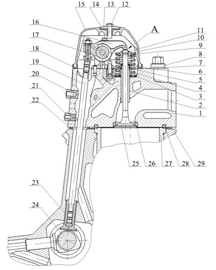 1 - вал распределительный; 2 - толкатель; 3 - направляющая толкателя; 4 - штанга толкателя; 5 - клапан выпускной; 6 - винт регулировочный; 7 - коромысло; 8- втулка; 9-тарелка пружины; 10 и 11- внутренняя и наружная пружины; 12 - шайба; 13-сухарь; 14-уплотнительная манжета впускного клапана; 15 - направляющая втулка клапана; 16-клапан впускной; 17-шестерня распределительного вала; 18-корпус подшипника; 19-втулка подшипника. Распределительный вал изготовлен из стали. Он имеет пять опорных шеек и шестнадцать кулачков, преобразующих вращательное движение вала в поступательное движение толкателей, штанги клапанов. Количество кулачков и их расположение соответствует числу клапанов и последовательности их открытия. Рабочие поверхности опорных шеек и кулачков цементированы и закалены токами высокой частоты. Профили у кулачков для впускных и выпускных неодинаковые, поверхности вершин кулачков скошены. Распределительный вал установлен в развале блока цилиндров на пяти подшипниках скольжения, представляющих собой стальные втулки, залитые антифрикционным сплавом. Задний подшипник установлен в опоре , которая крепится к блоку тремя болтами. На заднем конце вала при помощи шпонки закреплена прямозубая шестерня. От осевых смещений вал удерживается опорой, в которую с одной стороны упирается ступица шестерни , а с другой стороны - упорный бурт задней опорной шейки. Газораспределительный механизм: 1 – головка цилиндра; 2 – втулка направляющая; 3 – шайба пружин клапана; 4, 5 – пружины клапана; 6 – манжета клапана; 7 – шайба; 8 – болт крепления головки; 9 – тарелка пружин; 10 – втулка тарелки пружин; 11 – сухарь клапана; 12 – болт крепления крышки; 13 – шайба; 14 – шайба виброизоляционная; 15 – крышка головки цилиндра; 16 – коромысло клапана; 17 – стойка коромысел; 18 – прокладка крышки; 19 – штанга; 20 – ввертыш крепления впускного коллектора; 21 – ввертыш крепления водяной трубы; 22 – прокладка уплотнительная; 23 – толкатель; 24 – распределительный вал; 25 – выпускной клапан; 26 – седло выпускное; 27 – гильза цилиндра; 28 – кольцо газового стыка; 29 – блок цилиндров; А – тепловой зазор. Толкатели передают усилие от кулачков распределительного вала к штангам. Цилиндрическая направляющая часть толкателя пустотелая, в ней имеются два отверстия для слива масла из внутренней полости. Этим маслом смазывается боковая поверхность толкателей и кулачки распределительного вала. Внутренняя поверхность толкателя заканчивается сферическим гнездом, куда упирается нижний конец штанги. Торцевая поверхность толкателя, сопряженная с кулачком, для повышения износостойкости наплавляется отбеленным чугуном и имеет тарельчатую форму. Толкатели устанавливаются в чугунных направляющих, прикрепленных к блоку цилиндров. При работе двигателя толкатели постоянно вращаются вокруг своих осей, что обеспечивает их равномерный износ. Вращение толкателей достигается за счет сферической поверхности их тарелок и скошенных поверхностей кулачков распределительного вала. Штанги передают усилие от толкателей на коромысла, они изготовлены из стали, пустотелые, со вставными наконечниками. Нижний наконечник имеет выпуклую сферическую поверхность, верхний наконечник выполнен в виде сферической чашки. Для прохода смазки через штанги в наконечниках имеются отверстия. Коромысла передают усилия от штанг кла